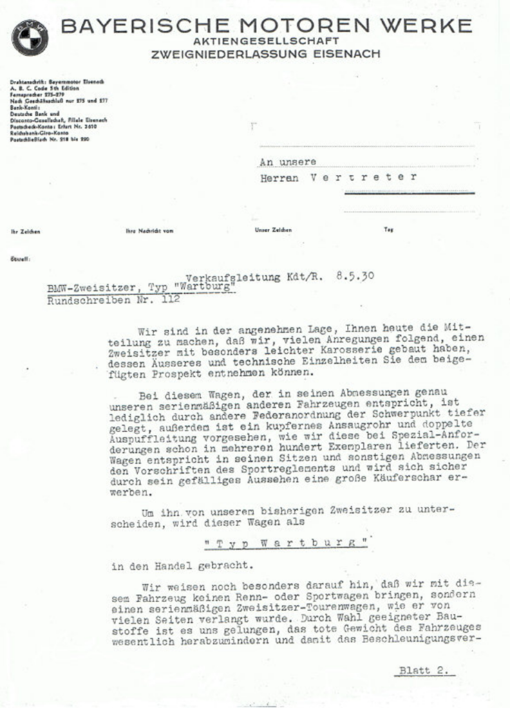 Dieser Typ war der erste von BMW in Eisenach gebaute Sportwagen. Wenn man „Sportwagen“ liest, denkt man sofort an großvolumige Automobile wie Bugatti, Mercedes SSK oder Bentley. Diese Fahrzeuge waren auch für betuchte Leute damals auch fast unerschwinglich. Bis 1929 gab es kaum kleine Sportwagen unter 1000 ccm Hubraum. Da gab es zwar z.B. den DKW P 15 mit 500 ccm oder auch den Austin Seven Ulster. Aber für ausländische Wagen war der Zoll zu hoch. Für BMW war es nur konsequent, den BMW DA 2 nach seinen sportlichen Erfolgen u.a. bei der Internationalen Alpenfahrt 1929 durch eine leistungsgesteigerte Sportversion zu ergänzen. Im Mai 1930 war es soweit: Anlässlich der Brandenburgischen Dauerprüfungsfahrt wurder der DA 3 „Wartburg“ vorgestellt und mit Begeisterung aufgenommen. Der DA 3 sollte RM 3100,- kosten – das waren zwar rund 50 % über den Preis des DA 2 Zweisitzers – aber für einen „Sportwagen“ immer noch günstig. Trotzdem verkaufte er sich gut und wurde 151 mal gebaut. Sicherlich wären es noch mehr geworden, wenn nicht 1932 die Austin Seven Lizenz ausgelaufen wäre und BMW mit eigenen Konstruktionen die AM – Typen mit kopfgesteuerten Motoren produzierte.
